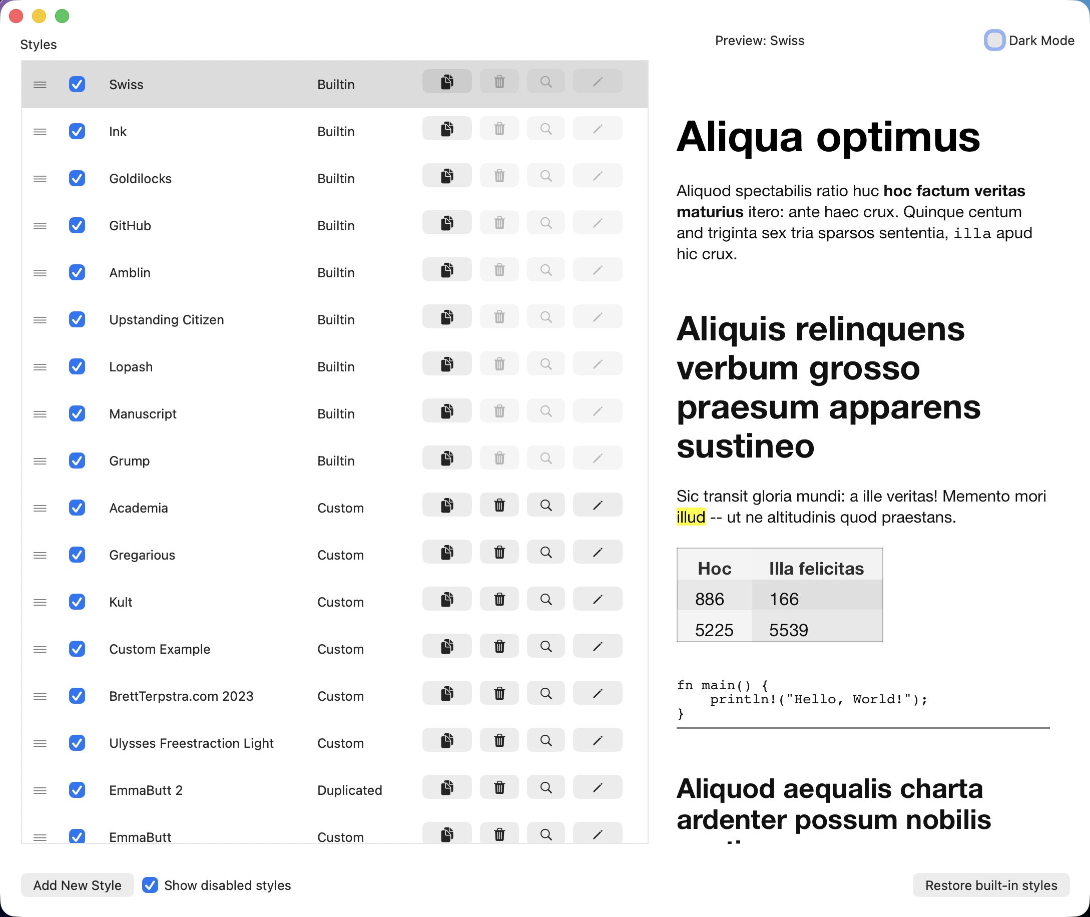 The right pane holds a preview that renders the selected style inside a full HTML document with a comprehensive set of headings, lists, tables, code blocks, etc. The preview uses the actual CSS on disk, so edits you make in your external editor update instantly. A checkbox toggles Dark Mode preview.