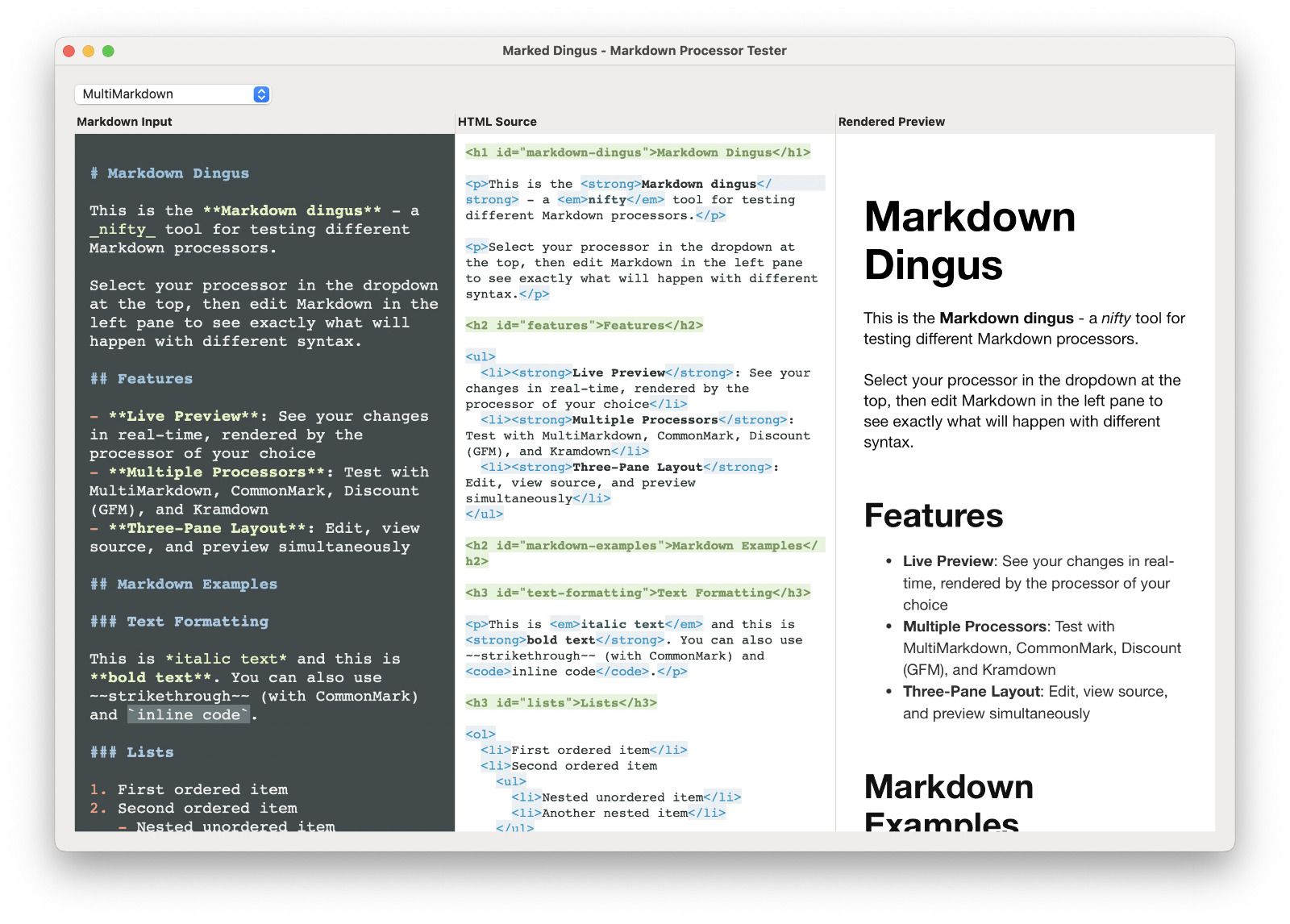 The Markdown Dingus is a specialized testing tool that helps you understand how different Markdown processors handle your content. It provides a three-pane interface where you can edit Markdown, view the generated HTML source, and see the rendered preview simultaneously.